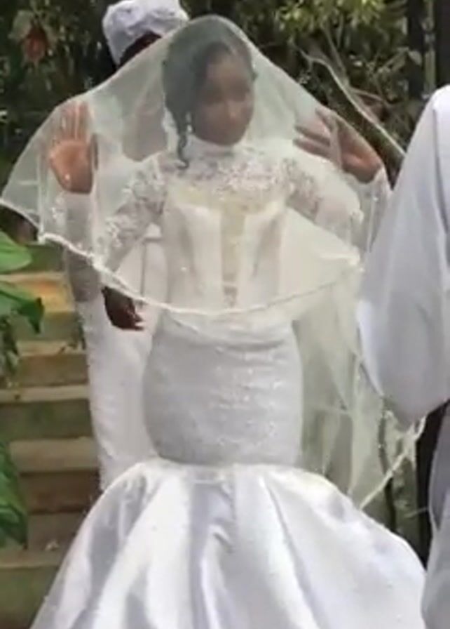 bride in a white gown standing outdoors. The gown has long lace sleeves, a detailed bodice, and a mermaid-style skirt that flares at the bottom. She is wearing a sheer veil adorned with small pearls. A woman in a white dress and white head covering adjusts the veil over the bride's face. A man wearing a white shirt is visible on the right. The scene is set in a lush, green outdoor area, possibly a garden, with trees and plants visible in the background. A set of stone steps can be seen behind the bride.