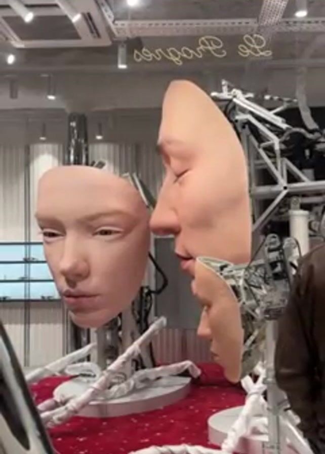 display with disembodied faces in what appears to be a store. There are three realistic human faces mounted on metal stands, giving the illusion of floating heads. The faces exhibit a range of expressions, one with eyes closed, another looking ahead with a neutral expression, and a third partially visible in the background. Wires and mechanical components are visible beneath the faces, suggesting they might be part of an animatronic display. The stands are situated on a red, textured surface resembling carpet or fabric. The environment suggests a modern, high-end retail setting with visible ceiling lights and a mirrored surface to the left. In the background, some clothing racks are visible. A man in a brown jacket is partially visible, standing off to the side.