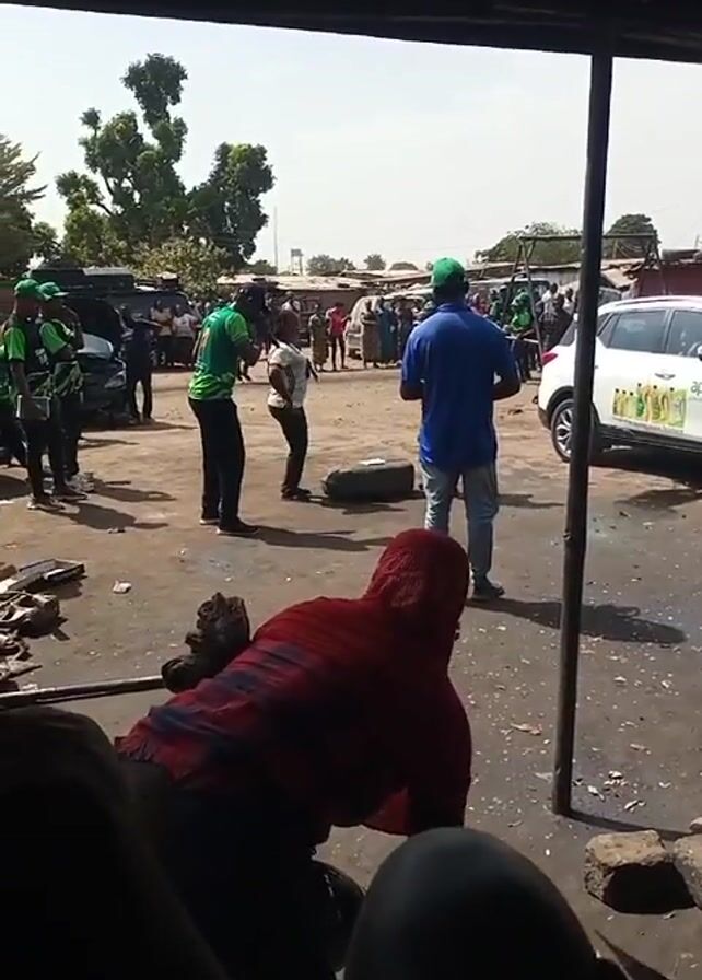 n outdoor scene with several people gathered. In the foreground, a person wearing a red top is partially visible, obscured by other individuals. The focal point is a woman in a striped shirt and black pants who is bending down to attempt something involving a rectangular object placed on a large, dark rock or tire. A man wearing a green shirt and black pants stands beside her, holding a microphone and appearing to offer guidance or encouragement. Behind the woman and the man with the microphone, there is a small crowd of people watching. In the background, there are vehicles, buildings, and trees, suggesting the scene is taking place in a somewhat developed or populated area. The ground appears to be a mix of dirt and paved surfaces.