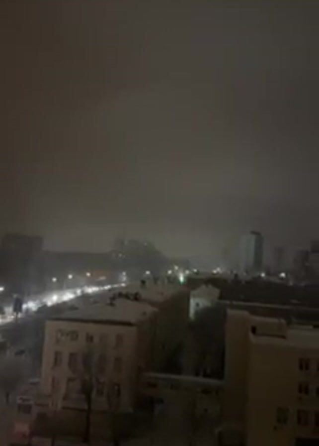 cityscape at night covered in snow. The sky is overcast and dark. Buildings with flat roofs are covered in snow, and lights illuminate the street below. Cars can be seen driving on the road, their headlights visible. In the distance, there are taller buildings silhouetted against the night sky. A McDonald's sign is visible on a building in the foreground.