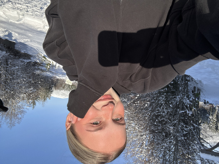 A person wearing a dark hooded sweatshirt is the primary subject. They are positioned upside down in the frame, with a partial view of their face. The background showcases a snowy landscape with snow-covered trees and a clear blue sky. The scene evokes a sense of winter and outdoor activity, potentially in a mountainous or wooded area.