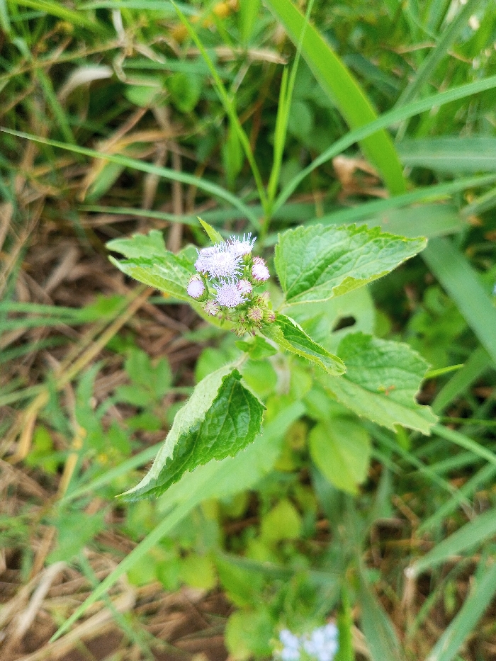 The image displays a small plant situated in Vieng Phouka, Laos. The primary subject is a plant with vibrant green, serrated leaves, centered in the frame. At its apex, a cluster of small, light purple to white thistle-like florets is visible, characterized by numerous fine, delicate filaments. Surrounding the central plant, the environment consists of a densely vegetated, out-of-focus background and foreground primarily composed of green grass and other foliage, interspersed with some dried brown organic material. No human subjects, animals, or discernible actions are present.