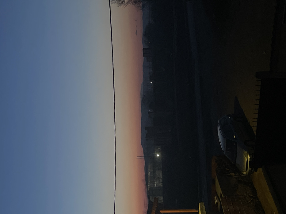 The image depicts an exterior scene at twilight in the city of Ihtiman, Bulgaria. The sky transitions from deep blue at the top to a light blue, then to a band of orange-pink above the horizon. A dark, single horizontal power line traverses the mid-upper portion of the frame. In the distance, a silhouette of mountains or hills is visible against the horizon. In the lower foreground, to the left, a partial brick structure is illuminated by an unseen light source. Directly in front of this structure, a light-colored station wagon, possibly a silver Ford Focus, is parked on a dark ground surface. Its front is partially lit, casting a shadow to its right. A dark, low fence or railing runs across the bottom of the foreground. The midground and background consist of dark structures and terrain under low light conditions. Several dark, rectangular buildings are visible, some with distinctive architectural features such as two prominent vertical elements (possibly smokestacks) on the left and a castellated-like top edge on another structure further right. Scattered points of artificial light are visible, indicating distant illumination from buildings or streetlights. Bare trees and dark vegetation are intermittently visible, particularly on the right side of the frame. No people or specific actions are discernible. The overall environment is dark, suggesting either dawn or dusk.