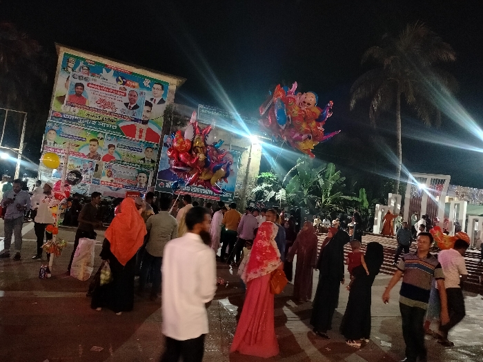 The scene is set at night in a bustling street in Charfasson Sadar, Bangladesh, with numerous people gathered around