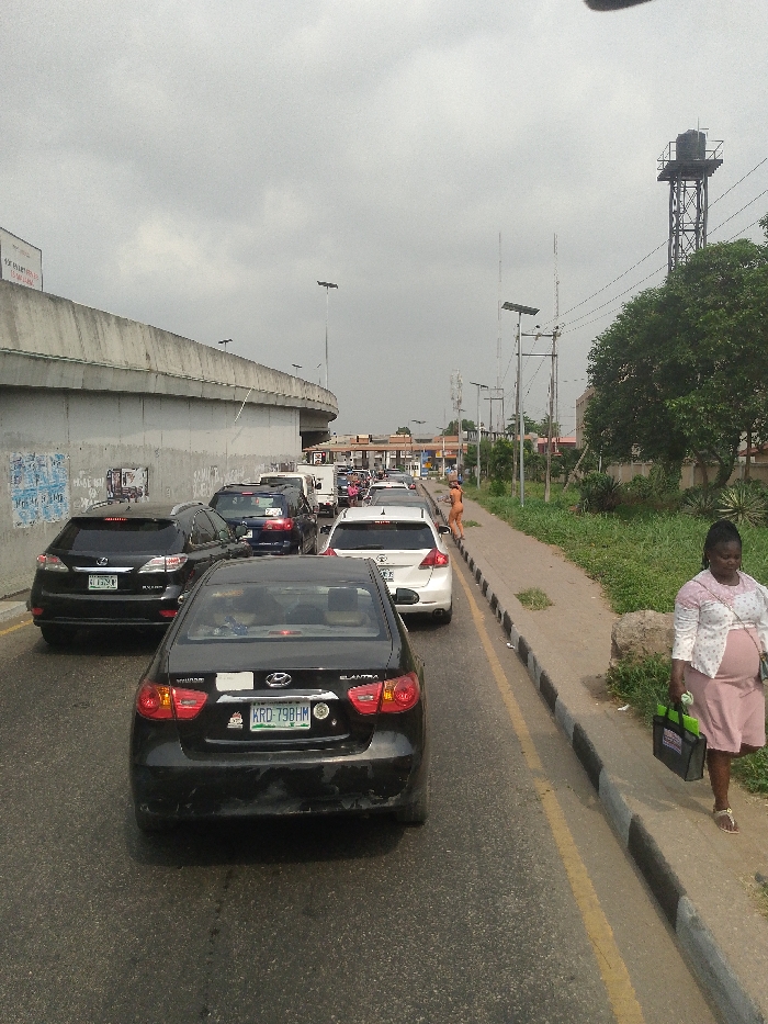 The image captures a congested urban road in Ikeja, Nigeria, under an overcast sky. In the immediate foreground, a black Hyundai Elantra sedan, bearing Nigerian license plate KRD-798HM, is stationary, facing away from the viewer. Behind it, a traffic queue extends into the distance, comprising multiple vehicles including a black Lexus RX SUV with license plate LGT-276-LL, a dark blue SUV, and a white sedan, among others. A white truck is visible further back in the queue. To the left, a curving, elevated concrete highway or flyover dominates the mid-ground, its lower wall adorned with numerous posters and flyers. On the right side of the road, a concrete sidewalk with a black and white curb runs parallel to the traffic. A woman, appearing pregnant, walks along this sidewalk from right to left. She is dressed in a white patterned top, a light pink skirt, and light-colored sandals, carrying a black bag with green contents in her left hand. Further down the sidewalk, near the queued vehicles, a second individual is visible from behind, appearing unclothed or in minimal skin-toned attire, positioned at the edge of the sidewalk adjacent to the road. Beyond the sidewalk, a strip of unkempt grass and dense vegetation, including shrubs and trees, is present. Numerous utility poles, some equipped with small solar panels, line this area. In the far right background, a tall metal lattice tower topped with a water tank stands prominently. In the mid-ground center-right, beyond the traffic, what appears to be a gas station with various structures and signage is visible. Vehicles are largely stationary, indicating traffic congestion.