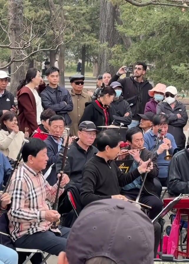 group of people gathered outdoors, presumably in a park. Most are seated, playing various traditional Chinese musical instruments such as the erhu, dizi, pipa, and yangqin. There's a crowd standing behind them, observing and taking pictures. The environment appears to be a public park with trees in the background, and the time of day is likely daytime. The musicians seem to be performing for the audience, and there's a sense of cultural activity taking place.