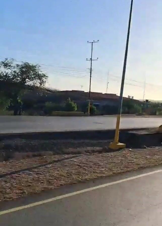 view from a vehicle driving on a road on a clear, sunny day. The road has a wide median covered in dry, sandy soil. Along the median, there are trees and shrubs. There's also yellow concrete barriers. On the other side of the median, there appears to be another road, buildings, and utility poles. Several cars pass on the other road. The sky is clear blue. The video is shot from the inside of the moving vehicle and part of the vehicle's window frame is visible.