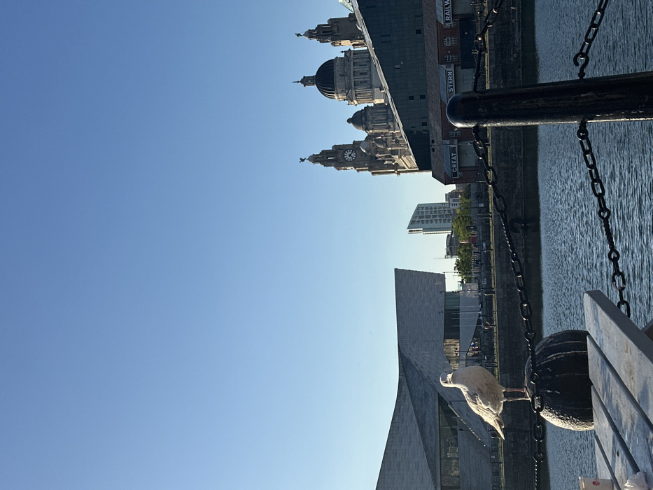 The photo, taken from a waterfront location in Liverpool, UK (latitude: 53.402, longitude: -2.994), showcases a seagull perched on a round bollard in the foreground. The bird is facing left. Behind the seagull is a body of water, likely the River Mersey, and a wooden table, presumably for eating. A black metal chain is strung across the water in the foreground. Behind the chain, the scene shifts to a stone-built quayside, lined with black metal bollards. Behind the quayside, the iconic Three Graces (Royal Liver Building, Cunard Building, and the Port of Liverpool Building) can be seen in the distance. Behind the Three Graces, a modern building with a sharp, angular design, the Museum of Liverpool, is prominent. The scene is bathed in the warm light of a clear summer day.