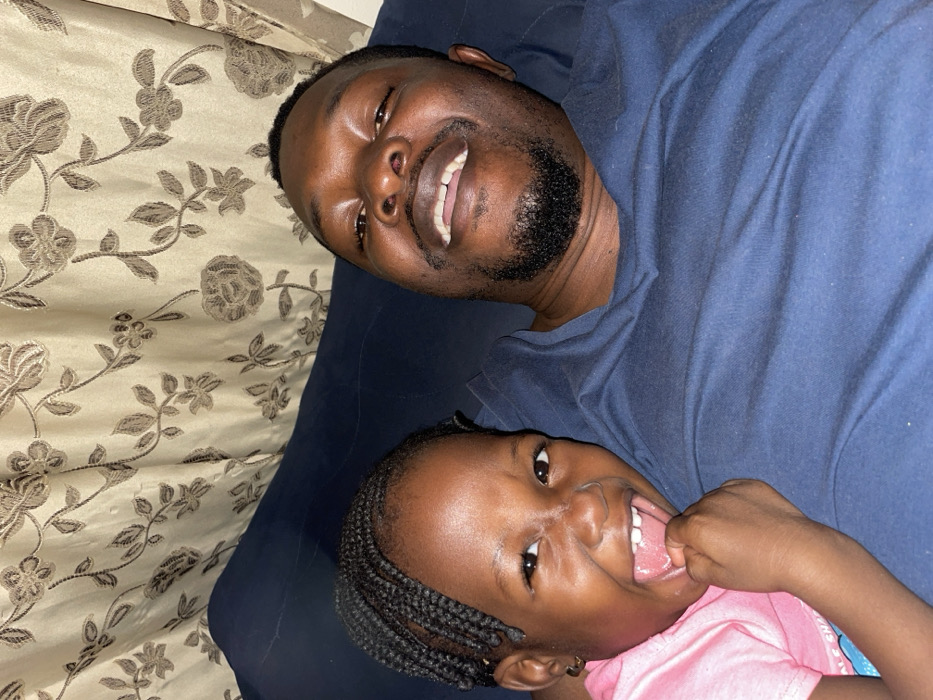 A man and a young girl are lying down, smiling and looking at the camera. The man has dark skin, short black hair, and a beard. He wears a navy blue shirt. The girl has dark skin and braided hair. She's wearing a light pink shirt and is sticking her tongue out. They are lying on a blue surface next to a beige patterned material.
