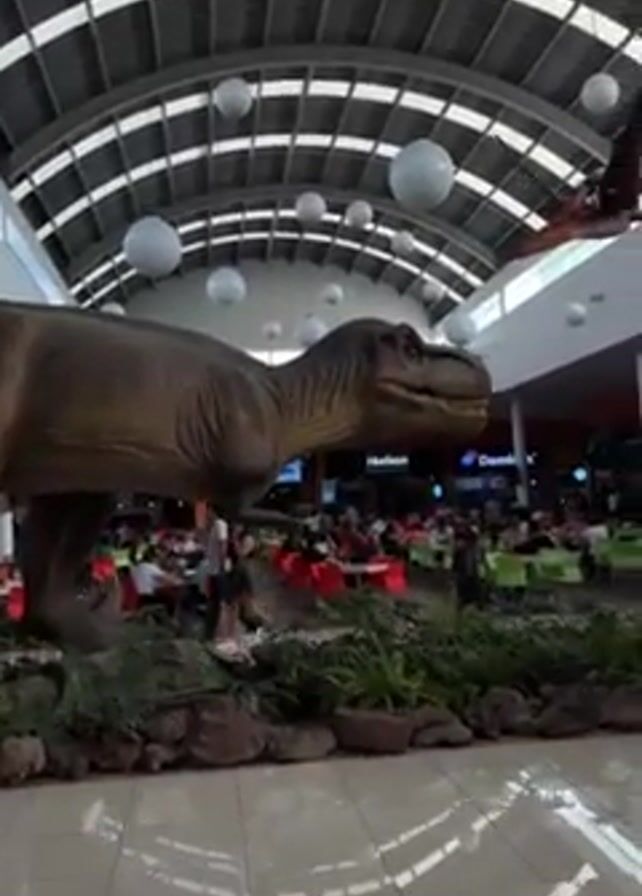 large indoor space, possibly a mall or a food court, with a high ceiling featuring a grid-like structure and several large, white, spherical light fixtures. In the foreground, there is a large, realistic model of a Tyrannosaurus Rex dinosaur surrounded by artificial plants and rocks. Behind the T-Rex, there's an area with tables and chairs where people are sitting and presumably eating. Various food establishments can be seen in the background, including a Domino's Pizza outlet and what appears to be a Hudson store. In the upper right corner of the frame, there's a model of a Pterodactyl dinosaur suspended from the ceiling. The camera is positioned on a shiny, tiled floor, providing a view of the entire scene. The overall impression is that of a commercial space trying to attract customers with dinosaur-themed decor.