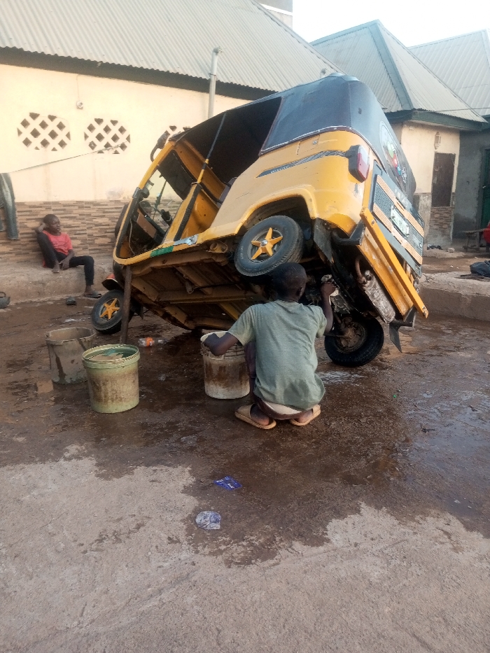 - "A yellow and black tuk-tuk is lifted for cleaning, resting on its side" by FM-Bivw32, licensed under CC BY 4.0