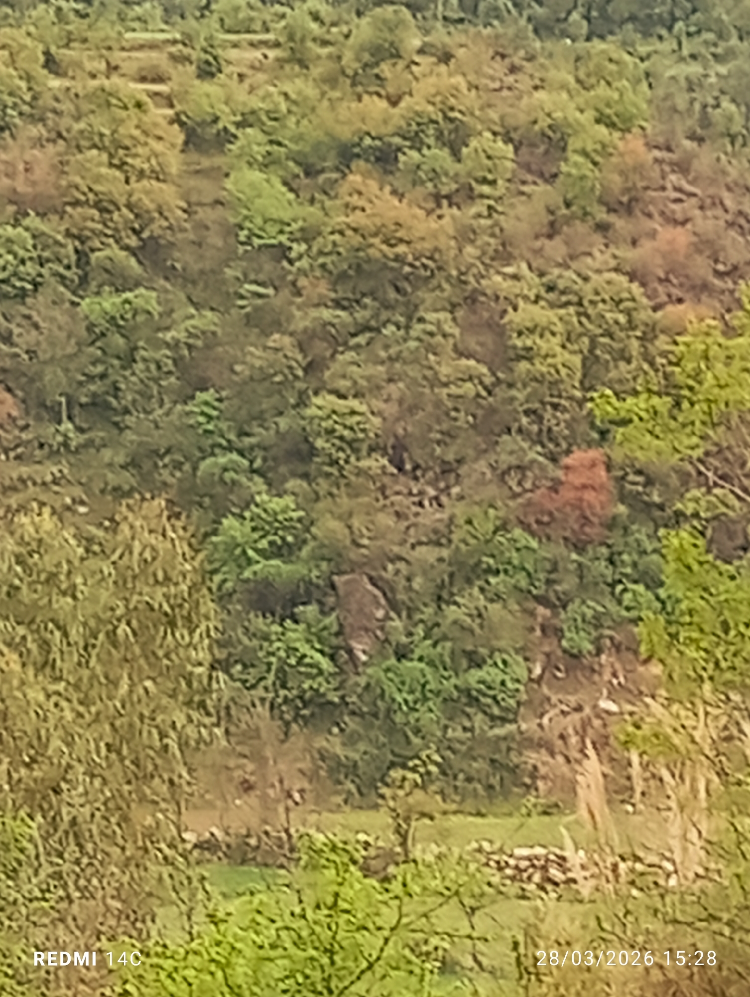 The image displays a steep, densely vegetated hillside in Grhala, Pakistan. The environment is characterized by a natural landscape covered predominantly in various shades of green foliage, indicating numerous trees and shrubs. Scattered within the green, some areas exhibit patches of brown or reddish vegetation. In the upper-central portion of the hillside, faint horizontal lines suggest the presence of terracing or agricultural steps cut into the terrain. Towards the lower-middle section, a low, irregular stone wall or collection of stacked stones is discernible, forming a boundary or structural element amidst the vegetation. No human individuals, animals, or overt actions are visible within the scene. The image quality is moderate, with some areas appearing soft or blurry upon close inspection. The embedded timestamp indicates the image was captured on 28/03/2026 at 15:28 by a REDMI 14C device.