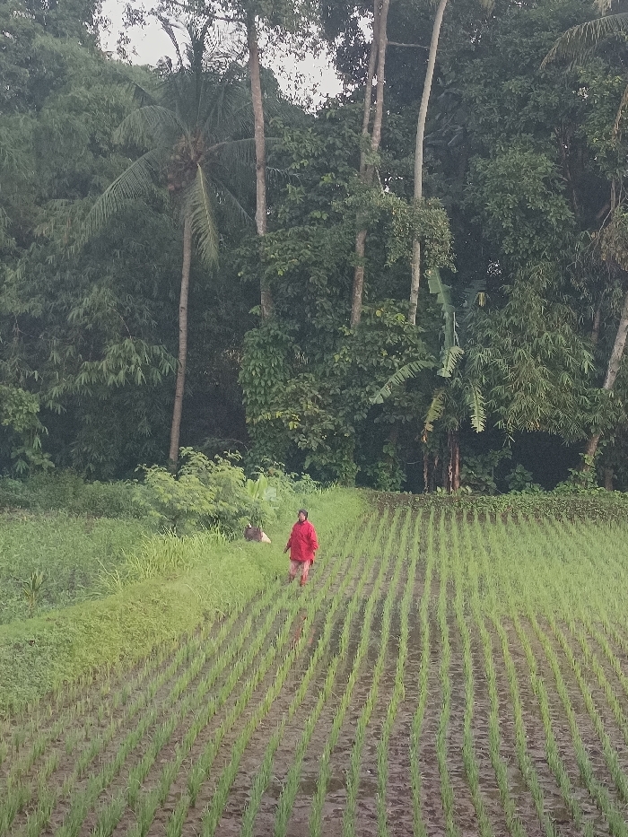 A person in a red garment walks through a field of young rice plants, set against a backdrop of lush green trees. Tall, slender trees and a coconut palm punctuate the skyline. The rows of rice plants create a pattern that leads the eye towards the person. A person is resting next to the path on the left-hand side of the image. The scene has a tranquil and rural atmosphere.