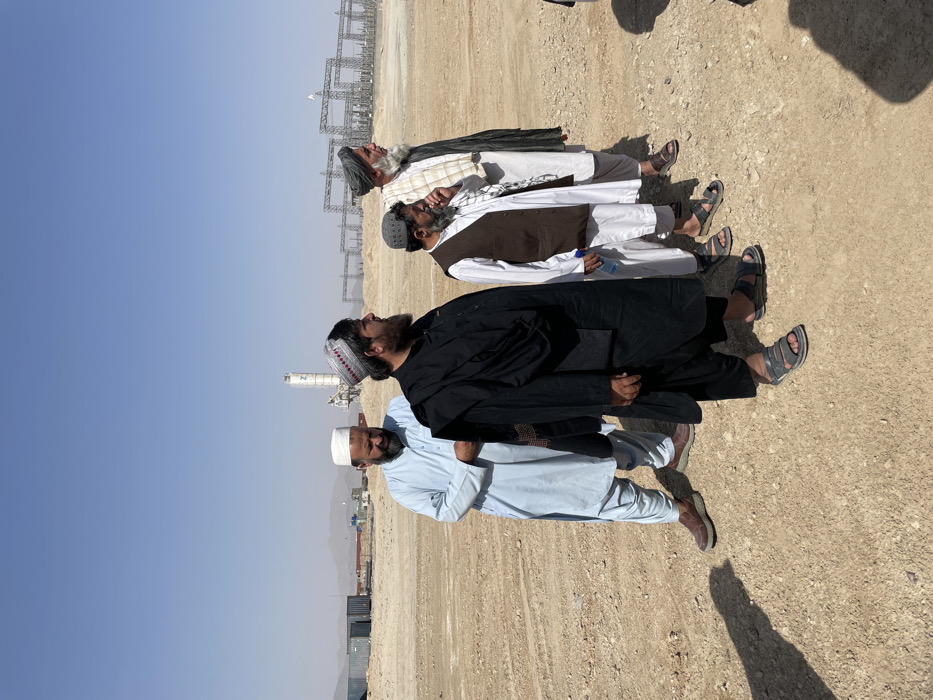 Four adult males are depicted standing outdoors on a dry, unpaved, light brown dirt or gravel surface under a clear, pale blue sky. The scene is located in Pir Dust, Afghanistan. All individuals are dressed in traditional attire: long tunics (shalwar kameez) and various head coverings. From left to right: 1. A male in a light blue shalwar kameez and a white skullcap, with a dark beard, stands facing slightly right, hands clasped near his midsection. He wears brown shoes. 2. A male in a black shalwar kameez, with a black shawl draped over his left shoulder and a grey and red patterned cap, stands in the foreground facing right in profile. He has a dark, full beard and wears grey sandals. 3. A male in a white shalwar kameez, a brown sleeveless vest, and a dark grey patterned cap, stands facing right in profile. He has a shorter beard and holds a small blue plastic bottle in his left hand. He wears dark sandals. 4. A male in a white shalwar kameez and a dark patterned turban, with a long white beard, stands facing right in profile. He wears dark sandals. All four individuals appear to be observing or listening to something or someone positioned to the right of the frame. Shadows of the men and an unseen object are cast on the ground, indicating bright sunlight. In the background, from left to right, are several shipping containers, followed by a tall white concrete batching plant with a "Z" logo, and further right, multiple unfinished metal lattice structures, consistent with a power substation or transmission infrastructure development. Distant, hazy mountains are visible under the clear sky.