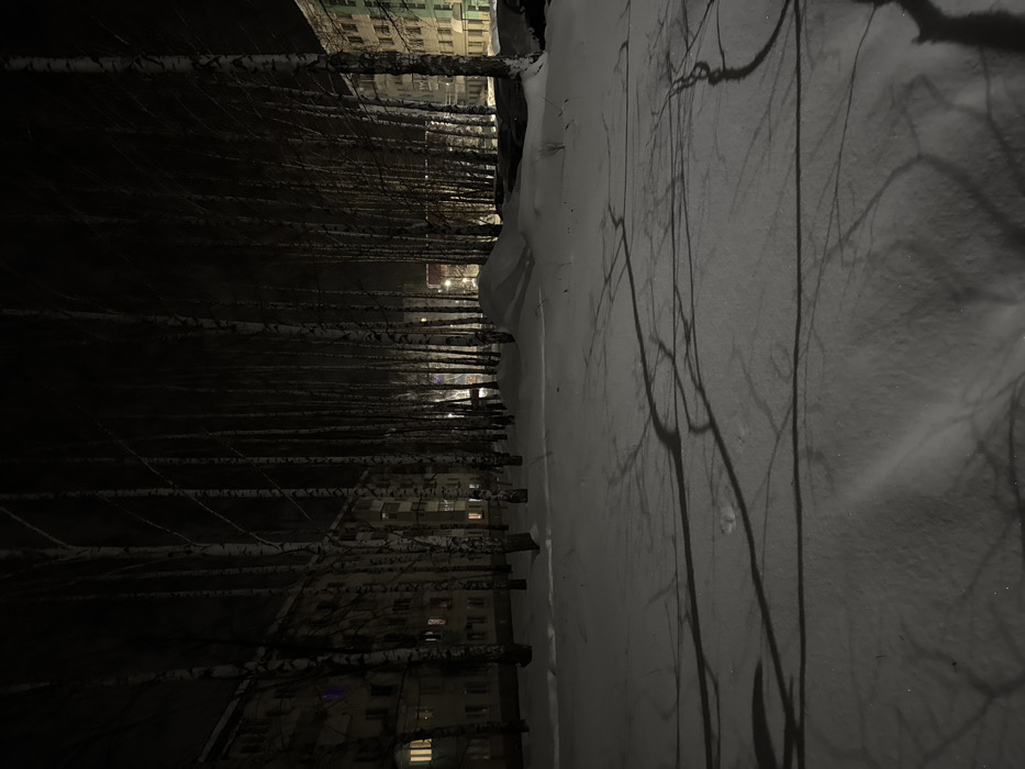 A high-angle shot shows a snow-covered urban environment. Bare tree branches, dusted with snow, extend horizontally across the left side of the image, creating a dark, linear pattern. In the background, illuminated buildings with multiple windows can be seen through the branches. To the right, a snow-covered surface reflects the shadows of trees, creating a contrast between the stark white and the dark outlines. The scene is mostly monochrome, emphasizing the interplay of light and shadow.