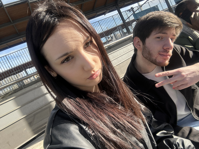 The image depicts three individuals outdoors under bright, direct sunlight, on what appears to be an elevated platform or walkway consistent with an urban transport station in Alfortville, France. The precise location within the city is not visually discernible. In the immediate foreground, a young adult female with long, dark hair, dressed in a black leather jacket, poses with a slight pout and direct gaze into the camera. Sunlight casts distinct shadow lines across her forehead and right cheek. To her right and slightly behind, a young adult male with light brown hair and a short beard wears a black jacket over a white ribbed garment. He holds his right hand in a V-sign gesture and looks slightly to his right. In the blurred background, a third individual, dark-skinned and wearing a dark jacket, is partially visible to the far right, appearing to be engaged with a mobile device held to their ear. The environment includes overhead metallic structures and railings, with a clear blue sky visible above, indicative of an outdoor, elevated urban setting.
