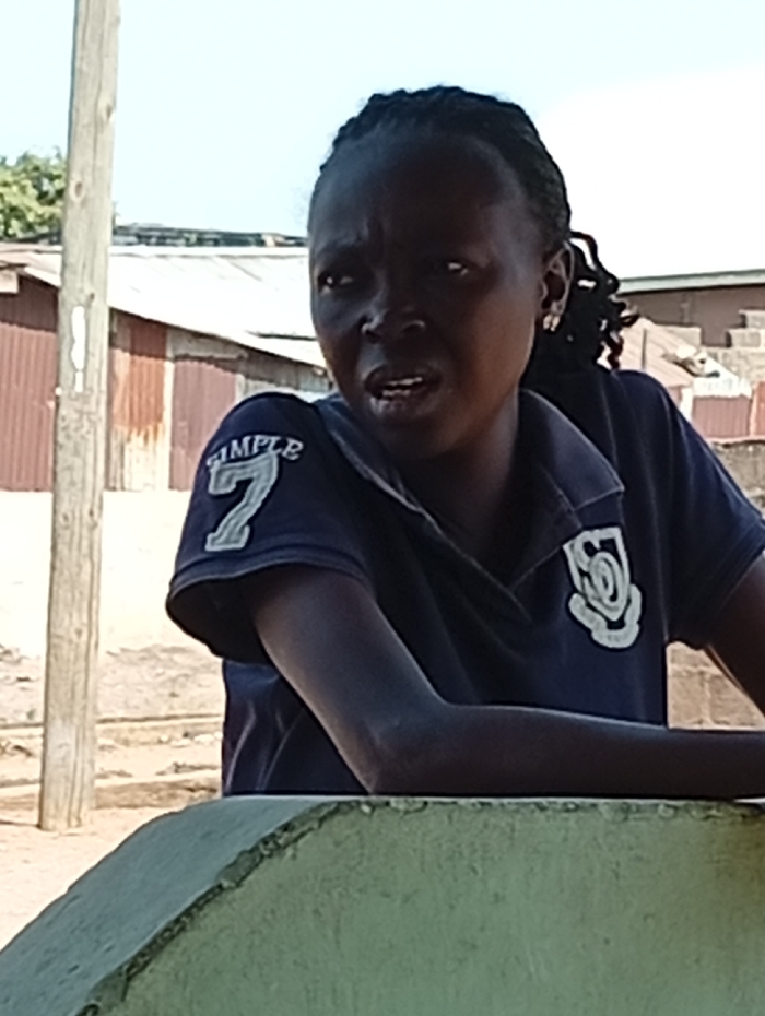 The image depicts a dark-complexioned female individual in Gboko, Nigeria, positioned in the midground, leaning on a light green, weathered concrete structure with her forearms