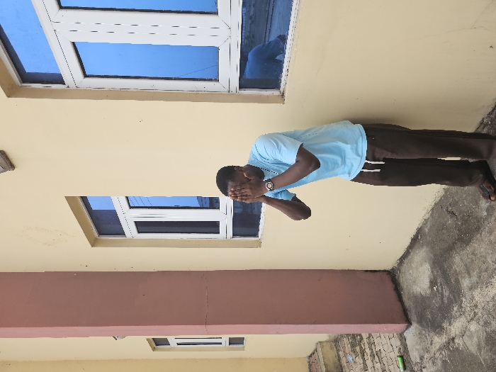 An outdoor scene in Ihiagwa, Nigeria, depicts an adult male standing in front of a light yellow building wall. The male subject wears a light blue short-sleeved t-shirt, dark brown trousers with a white drawstring, and dark flip-flops. He has a dark-colored watch on his left wrist. Both hands are raised, covering his face, with fingers slightly spread. The building wall features multiple white-framed windows with reflective blue glass; a partial reflection of a person is visible in the window on the far right. To the left of the subject, a prominent reddish-brown vertical pillar or column is present, with a smaller window partially visible beyond it. The ground surface is concrete, showing signs of wear and dirt. A small, crumpled green object is discernible on the ground near the base of the reddish-brown column. Reddish-brown brick steps are partially visible behind the column on the left.