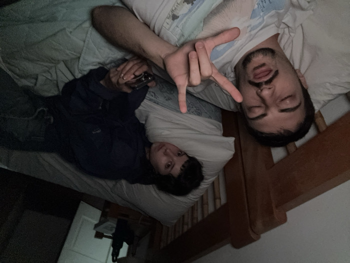 Two young men are lying on a bed. One, wearing a white t-shirt, is closer to the camera with his eyes closed and making a hand gesture. The other, wearing a dark jacket, is holding a phone and looking at the camera. The bed has a wooden frame and a white comforter. A glimpse of a doorway and clothing hanging is visible in the background.