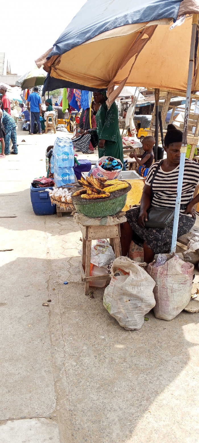 An outdoor market scene in Agunmo, Nigeria, captured during daylight hours with bright sunlight