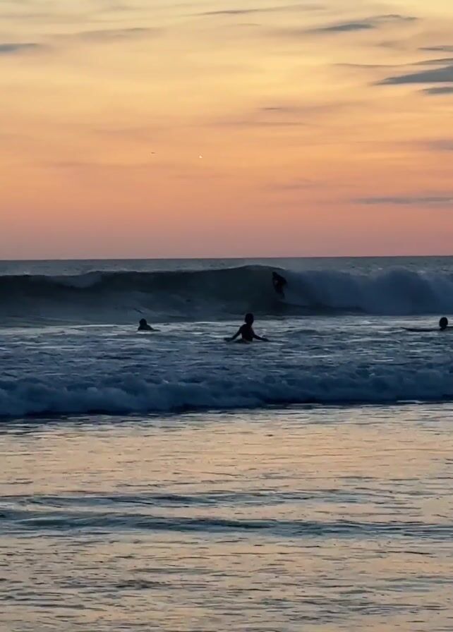 The video depicts a beach scene at dusk, with a sunset painting the sky with shades of orange and pink. The sea is in the foreground, with gentle waves breaking on the shore. Several surfers are visible in the water; one surfer rides a wave while others are paddling or waiting for waves. The water reflects the colors of the sunset, creating a serene and picturesque environment.