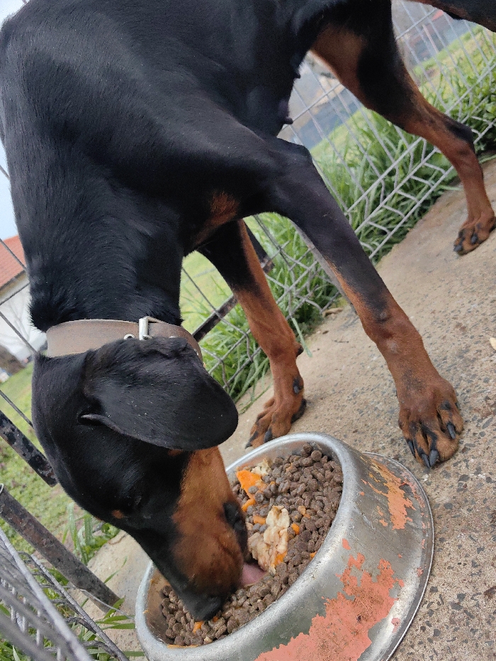 - "A black and tan Doberman dog, wearing a brown leather collar with a silver buckle, is captured in the act of eating from a weathered metallic food bowl" by FM-tqeth1, licensed under CC BY 4.0