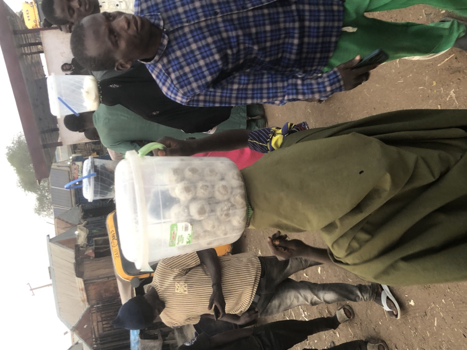 An outdoor street scene in Kufena, Nigeria, depicts multiple individuals amidst a backdrop of rudimentary structures with corrugated metal roofs and an unpaved dirt ground. In the foreground, a person, largely obscured by a flowing olive-green garment, balances a transparent plastic bucket filled with numerous pale, spherical objects on their head. The bucket has a white lid and a green handle held by the individual's right hand, which also exhibits henna patterns. To the immediate right, a man in a blue and white plaid shirt and green track pants holds a black smartphone in his right hand, looking forward. To the left, a man wearing a beige striped t-shirt, dark jeans, and a dark blue beanie hat is engrossed with a smartphone held in both hands. He wears white flip-flops. In the mid-ground, another individual in a dark abaya also carries a similar clear plastic bucket on their head. A yellow three-wheeled auto-rickshaw is partially visible between the figures on the left. The background features additional individuals, distant utility poles with wires, and a covered market stall structure. The sky is bright but appears hazy.