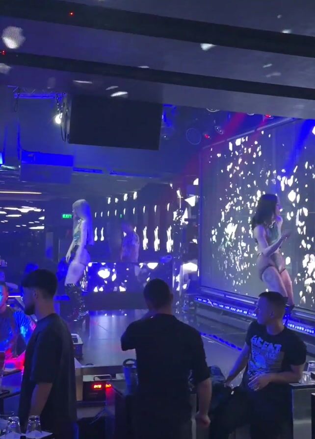 two women dancing on a stage in what appears to be a nightclub. The women are wearing revealing outfits and high boots. A light show and music play in the background. Several men stand near the stage and watch the performance. The club is dimly lit with blue lighting. Some tables with drinks are visible. One sign with "EXIT" on it is also visible.