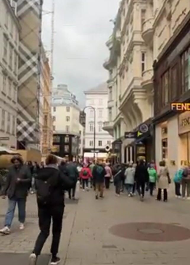 street scene in what appears to be a European city. The street is paved with stones and lined with tall buildings in a classical architectural style. The sky is overcast. Many people are walking along the street, and there are several stores visible, including Fendi and Burberry (which is covered in a checkered pattern). An accordion player stands near the side of the street playing music and collecting money in a cardboard box.
