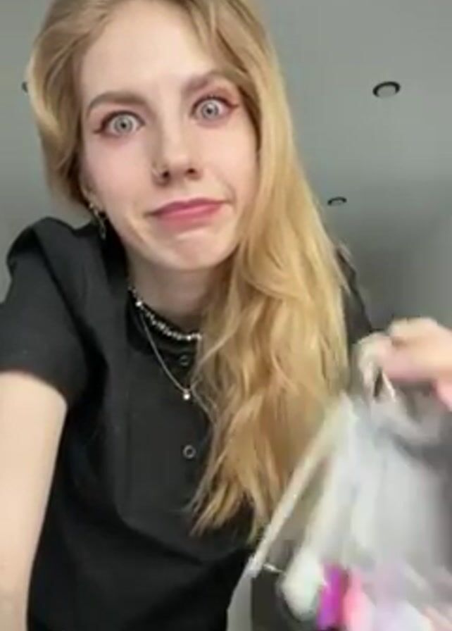 A woman with long blond hair and wearing a black collared shirt holds up a nail color display fan and shakes it for the camera. She is fair-skinned and has a nose piercing and necklace. Her eye makeup is a prominent reddish-pink color. A tattoo is visible on her forearm. The background is a white room with recessed lighting. The angle is from below, looking up at the woman.