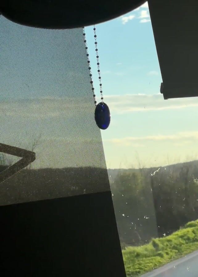 The view through a car window shows a landscape under a blue sky with some clouds. A beaded chain with a small, reflective pendant hangs inside the car, partially obscuring the view. The landscape consists of a green field transitioning into a darker area of trees or foliage in the distance. The sky is visible above the landscape, and the car's interior is visible in the foreground, including a textured sunshade and the upper edges of the window frame. There are minor smudges on the window. The car appears to be in motion.
