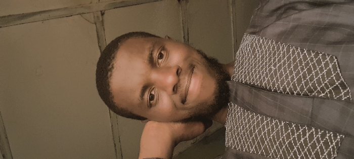 A young adult male with dark skin, short dark hair, and a full beard is depicted in a head-and-torso portrait, smiling slightly towards the camera. He wears a dark grey traditional Nigerian garment featuring white cross-hatch embroidery on the chest and collar. His left hand is positioned behind his head. The background consists of a dimly lit, light-colored interior wall with a visible dark structural beam or frame extending diagonally from the upper right. The scene is located in Toto, Nigeria.