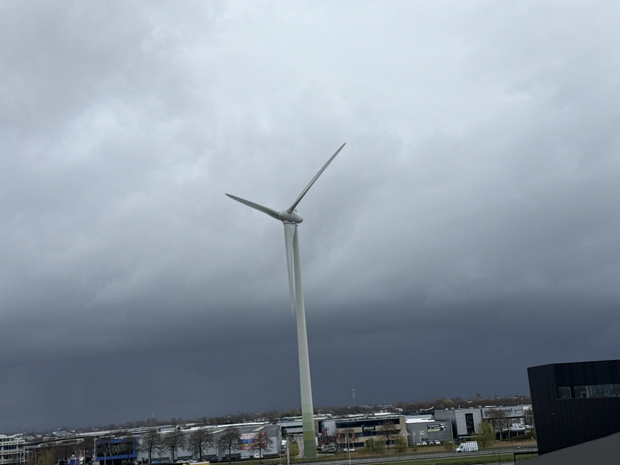 An elevated, wide-angle shot depicts an industrial landscape in Maasdijk, Netherlands, under a heavily overcast sky. A large, three-bladed wind turbine, predominantly white with a green band near its base, stands centrally in the frame. Two of its blades are visible, angled upwards. The sky transitions from a light gray overhead to a dark, dense gray towards the horizon. Below the turbine, an active commercial and industrial zone is present, featuring numerous multi-story buildings of various architectural styles, including one with "deBommel" visible and another with "Efficient" on its facade. A highway or major road traverses the midground, occupied by multiple vehicles, including cars and vans. Scattered deciduous trees, largely bare, are visible throughout the landscape. A dark, angled structure occupies the lower right foreground. No individuals are explicitly discernible in the scene.