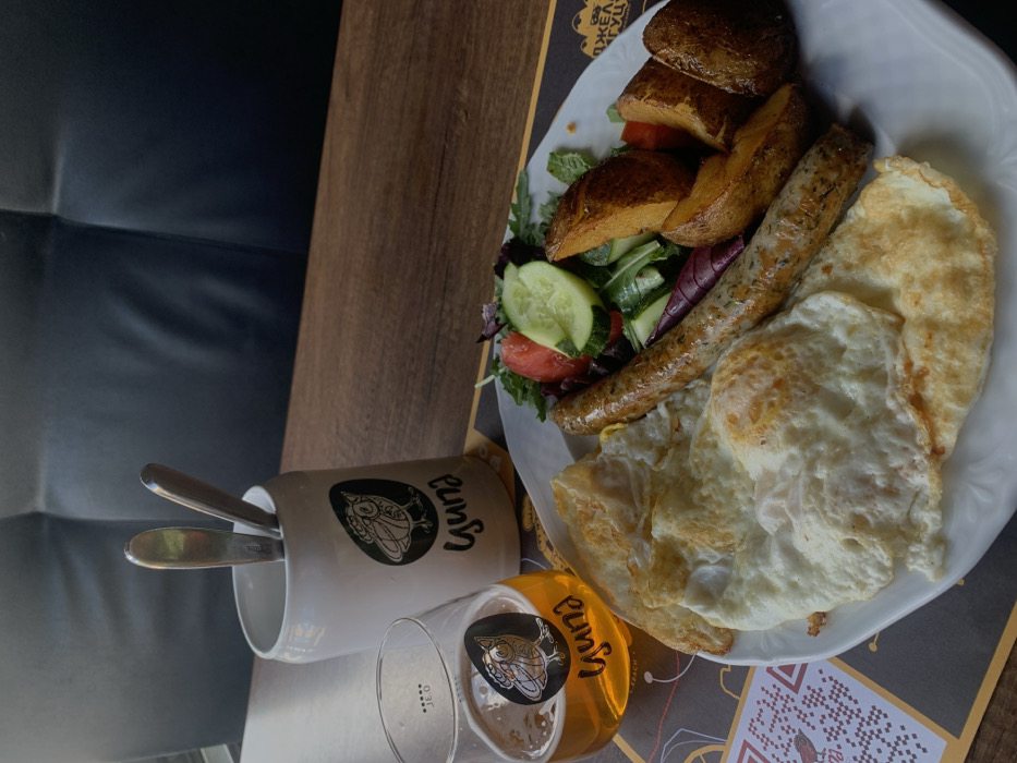 A close-up, elevated view captures a ready-to-eat meal presented on a dark wooden table within a restaurant or cafe in Yasinia, Ukraine