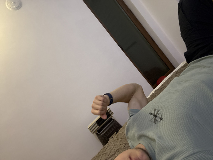 The image depicts an indoor scene with a partial view of an individual lying down. The specific location in Zlatograd, Bulgaria is not discernible from the visual content. A male individual is positioned on a textured, light brown surface, likely a bed or sofa. He is wearing a light green, possibly waffle-knit, long-sleeved shirt with the "CK Calvin Klein Jeans" logo visible on the left chest. His right arm (viewer's left) is bent at the elbow, and the hand is clenched into a fist, revealing a dark blue wristband or watch strap. The lower portion of his face, including the chin and mouth area, is visible at the bottom edge of the frame. A bent leg, clad in dark pants or leggings, is visible in the upper right corner. The environment includes a plain white ceiling in the upper left, featuring a white, circular ceiling fixture. Along the upper right side, a window with a dark frame and dark glass or paneling is visible, possibly a skylight or a high-set window. Below the window, on what appears to be a sill or ledge, there is a small, dark-colored object with horizontal slats, potentially a heater or vent, and a small, bright red, rounded object. The lighting suggests an indoor setting, likely artificial.