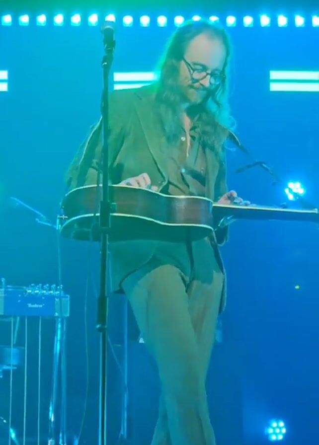 A man in a green suit is standing and playing a lap steel guitar under blue and green stage lights. He has long hair and a beard, and wears glasses. A microphone is in front of him. Behind him is a steel guitar stand and a light display. He appears to be performing on stage.