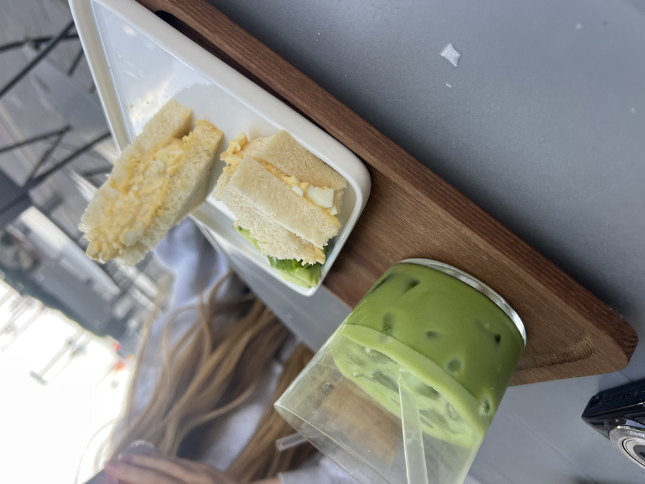 A street-side cafe table in Tel-Aviv, Israel, is depicted with a wooden tray serving as the central subject. On the tray, a clear glass filled with iced green matcha beverage, containing a clear plastic straw, is positioned to the left. To its right, a white rectangular plate holds three triangular sandwiches. Two sandwiches are visibly prepared with egg salad, one standing upright and the other lying flat. A third, smaller triangular sandwich with visible green lettuce is also present. To the immediate left of the wooden tray, a person with long, light brown hair is partially visible. Their face is obscured by their left hand, which is positioned near their cheek. They are wearing a light-colored, possibly white or light grey, long-sleeved garment. In the lower-left corner of the frame, a black compact camera with silver accents is partially visible on the dark grey table surface. The background is out of focus, revealing blurred elements consistent with an urban outdoor setting, including indistinct structures and a bright, overcast daylight.