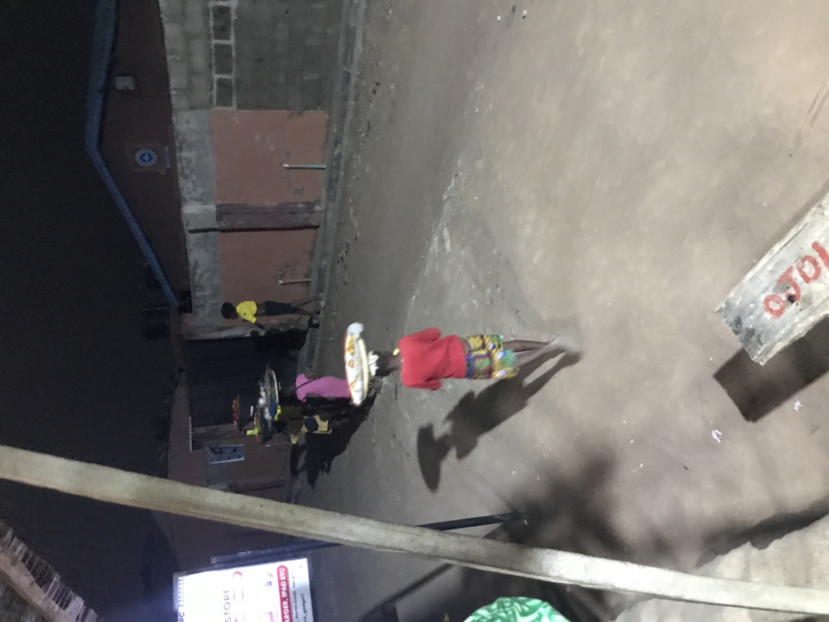 An eye-level outdoor shot depicts a street scene. A person in a red shirt and patterned shorts lies on the ground, casting a shadow. Another figure in yellow stands further away. A pink object sits near a bicycle. The urban environment includes buildings with brick and painted walls, signage, and overhead wiring, contributing to the somewhat cluttered street. The lighting suggests either dusk or an area with dim illumination.