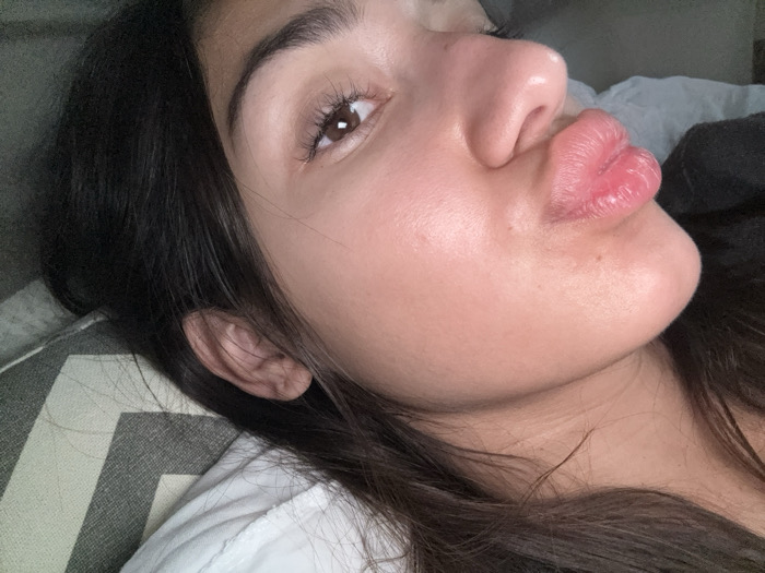 A fair-skinned woman with dark hair puckers her lips toward the camera. Her head rests on a gray and white pillow, with a white shirt visible beneath her hair. Her dark brown eyes are open, showing long lashes. The lighting is soft, highlighting the contours of her face and the slight shine on her skin. The photograph is taken from a close-up, slightly angled perspective.