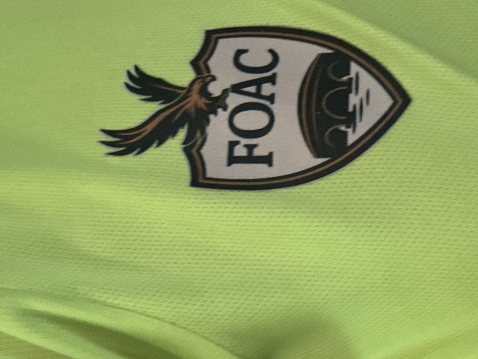 The image presents a close-up, slightly angled view of a neon yellow-green, finely meshed fabric, consistent with athletic or performance wear. Affixed to the fabric is a shield-shaped emblem featuring a prominent dark brown outer border and a thinner inner gold-brown outline, enclosing an off-white background. At the top of the emblem, a brown and black eagle with outstretched wings is depicted in flight, facing right. Centered below the eagle are the dark, capitalized sans-serif letters "FOAC." The lower section of the emblem displays a stylized, dark brown, multi-arched bridge, which represents the Naraguta Bridge (also known as the Bridge of Unity) located in Jos, Plateau State, Nigeria. This bridge design is positioned over three horizontal wavy lines, symbolizing water. No individuals or additional environmental details are visible; the focus is solely on the fabric and its emblem.