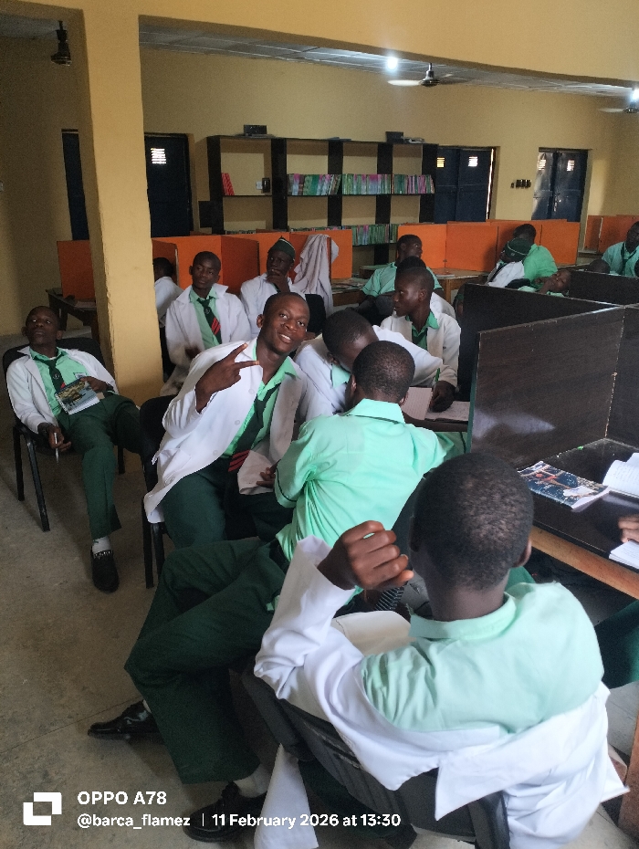 The image depicts an indoor scene within a study hall or library in Unknown, Unknown. Approximately 15 to 20 young males are visible, predominantly dressed in white lab coats over light green shirts and dark green trousers. The subjects are seated at dark brown wooden desks with orange partition dividers, forming individual study carrels. Books are present on the desks and stored on dark brown wooden bookshelves lining the back wall. In the foreground, one male smiles at the camera and forms a "peace" sign with his right hand. To his left, another male leans back in a black chair with his eyes closed, holding a book on his lap. Several other males are dispersed throughout the room, some engaged in interaction, others appearing to be studying or resting. One individual in the mid-ground rests his head on a desk. The environment features light yellow-beige painted walls, a light grey ceiling equipped with ceiling fans and light fixtures, and a light-colored floor. A dark blue door is visible on the left side of the back wall. The image bears a watermark indicating "OPPO A78 @barca_flamez | 11 February 2026 at 13:30."