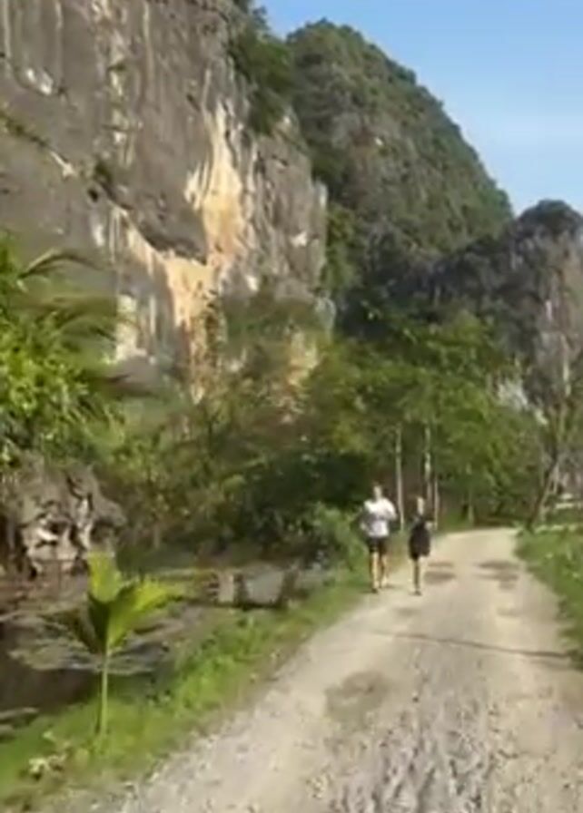 Two people, a man and a woman, are running along a gravel path. The man is wearing a white and blue striped shirt with dark shorts, while the woman is wearing all black. The path is bordered on one side by a body of water with small green plants, and on the other side by dense green trees and vegetation leading up to a tall, rocky mountain. The sky is bright blue.