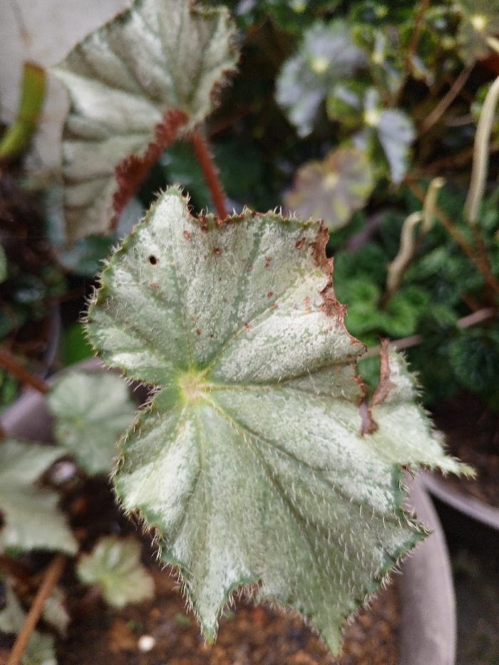 The image features a begonia plant, with a large, pale green leaf as the focal point. The leaf has serrated edges with fine hairs. There are brown, damaged areas on the edges of the leaf. Its surface exhibits a mottled texture. Several other leaves and stems are visible in the background, along with the edge of a pot filled with brown soil.