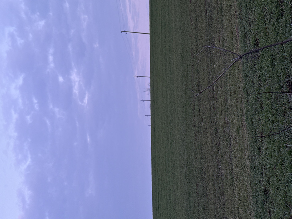 This image depicts an outdoor, rural landscape in the vicinity of Sini Vir, Bulgaria, under a pale purple-blue sky with scattered, textured clouds. The scene is bisected by a flat horizon line. Above the horizon, a series of at least six wooden utility poles with visible wires extends diagonally from the upper right toward the left, receding into the distance. Sparse, bare tree branches are faintly visible behind some of the utility poles. Below the horizon, a wide field of vibrant green, low-growing vegetation, possibly young crops or grass, covers the landscape. In the immediate foreground, specifically in the lower right quadrant, a portion of a leafless, dark, multi-branched woody plant with visible thorns is angled upwards, partially obscuring the field. No people, active subjects, or specific interactions are present. The lighting is dim and diffused, suggesting either twilight hours or an overcast condition.