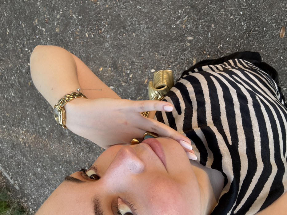 A low-angle shot showcases a woman with light skin, adorned with a gold wristwatch and a ring with a turquoise gemstone. Her gaze is directed towards the camera, revealing brown eyes and defined eyebrows. Her hand is positioned near her face, showcasing pink manicured nails. A zebra-striped garment partially covers her chest, adding a contrasting pattern to the composition. A golden clutch purse rests near her arm. The background appears to be a gray pavement surface.