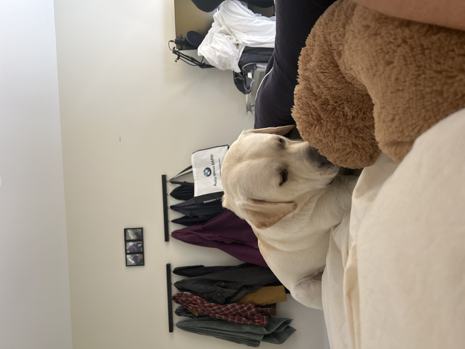 This image depicts an indoor bedroom scene within a residence in Squamish, Canada. The specific location within Squamish is not identifiable from the visual evidence. A cream-colored Labrador retriever dog occupies the central foreground, resting on a bed covered with light-toned bedding. Its head is lowered, and its snout is positioned near a large, light brown, fluffy object, indicating an action of sniffing or gentle contact. To the immediate right of the dog and partially obscured by the fluffy object, a human leg clad in dark blue or black material is visible on the bed. The background wall is light-colored. Two black, wall-mounted coat racks are present; the left rack holds a grey towel, a red plaid shirt, a yellow garment, and a dark jacket. The right rack supports a dark purple garment, other dark coats, and a white "Auto West BMW" branded tote bag. Centered above these racks is a small, horizontally oriented triptych art piece. To the far right, a black microphone arm stand with an attached microphone is positioned on a surface, behind which rests a pile of white fabric. The room is uniformly illuminated by ambient light.