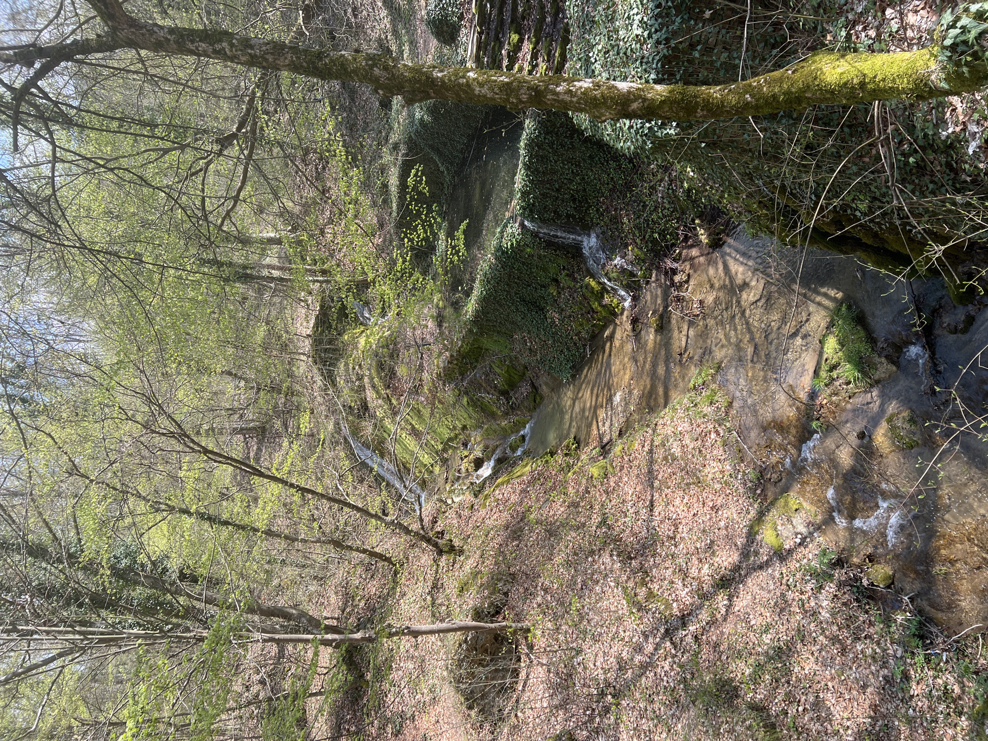 The image depicts a forest scene with a stream flowing through it. The stream has small waterfalls created by moss-covered rock formations and ivy-covered embankments. The ground is covered in fallen leaves. The trees are mostly bare, with some showing early signs of budding leaves. The location is in Cheresha, Bulgaria. There are no people visible in the scene. The focus is on the natural environment.