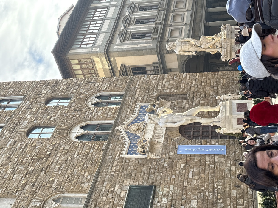 This image displays an outdoor scene in the Piazza della Signoria, Florence, Italy, under daylight conditions. The prominent structure on the left is the rusticated stone facade of the Palazzo Vecchio, featuring multiple arched windows and a central blue and gold decorative frieze with lion figures and heraldic shields situated above the main entrance level. A vertical blue banner with the text "MUSEO di Palazzo Vecchio" hangs from the facade. Directly in front of the Palazzo Vecchio stands a large white marble statue of a nude male figure, identified as a replica of Michelangelo's David, positioned on a multi-tiered pedestal. To the right, a section of the historic Loggia dei Lanzi is visible, featuring a large white marble statue group depicting two male figures, one standing over a crouching figure, identified as Hercules and Cacus by Baccio Bandinelli. The building extending above the Loggia dei Lanzi exhibits multiple levels with windows and a projecting upper floor. The lower third of the image is densely populated with individuals, primarily adults, dressed in various winter garments including coats and hats, indicating cooler weather. They are observing the surrounding architecture and statuary. A woman with dark hair and a brown coat is partially visible in the extreme lower-left foreground. An individual wearing a light grey baseball cap is partially visible in the extreme lower-right foreground. The sky overhead is partially cloudy.