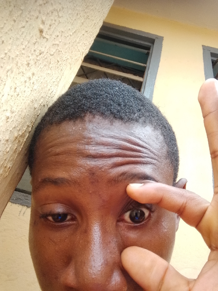A close-up image, taken at an upward angle, shows the upper face and head of a person of African descent, depicted in Umuokpu, Nigeria. The subject has short, black, tightly-curled hair and dark brown skin, which appears somewhat shiny on the forehead and nose bridge. Prominent horizontal wrinkles are visible across the forehead. The subject's left hand (viewer's right) is positioned with the index finger and thumb actively pulling on the skin around the subject's left eye (viewer's right), causing it to be wide open with a dilated pupil containing a bright reflection. The right eye (viewer's left) is partially closed. A faint vertical line is visible below the left eye. The background on the left consists of a textured, light beige wall or pillar. To the upper right, a lighter yellow wall is visible with two dark-framed windows, one of which shows horizontal teal-colored slats.