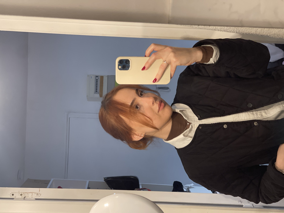 A young adult female with reddish-brown hair styled in a bun with bangs, light skin, and dark eyes is depicted taking a mirror selfie in an interior location, likely in Reims, France. She is wearing a brown turtleneck, a white collared shirt, and a black quilted jacket with snap closures. Her fingernails are painted red, and she wears a silver-toned star-shaped ring on her left ring finger. She holds a light beige-colored smartphone with her right hand, which reflects her image. The background, visible in the mirror, consists of white walls. To the left, a white circular light fixture and a partial view of white shelving with a dark object are visible. In the upper right background, an electrical panel with multiple switches is mounted on the wall.